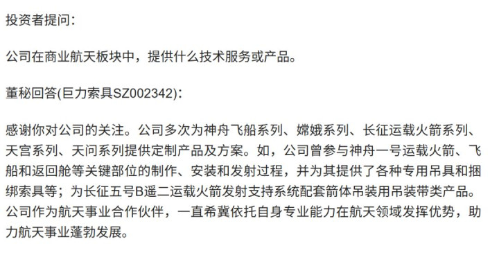 年前,巨力索具发布的机构调研公告裸露,巨力参加了神舟、嫦娥、长征、玉阙、天问五大系列供应链。是以巨力还是的故事,因为营业航天认识的升起,被本钱市集从头翻出来详察。