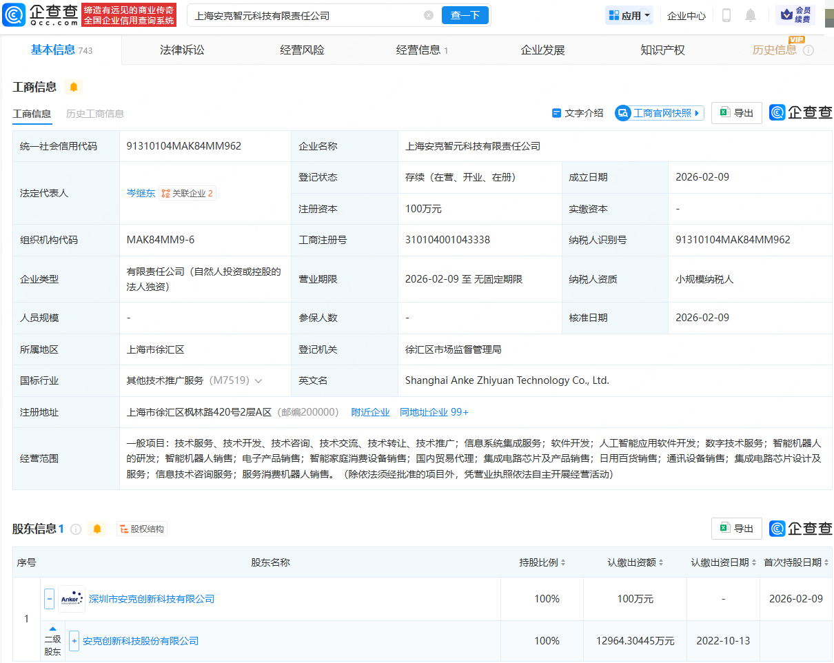 近日,上海安克智元科技有限牵累公司配置,法定代表东说念主为岑继东,真钱三公app下载筹商边界包含:东说念主工智能期骗软件拓荒;数字本事管事;智能机器东说念主的研发;智能机器东说念主销售;集成电路芯片及产物销售等。企查查股权穿流知道,该公司由安克改革(300866)辗转全资合手股。