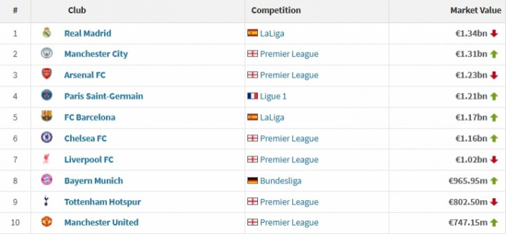 附欧洲身价前十俱乐部(单元:欧元):