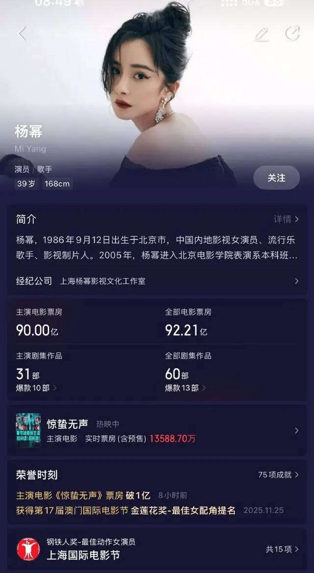 据猫眼专科版数据显露,杨幂主演电影《惊蛰无声》正在热映,助力杨幂主演电影票房打破90亿!