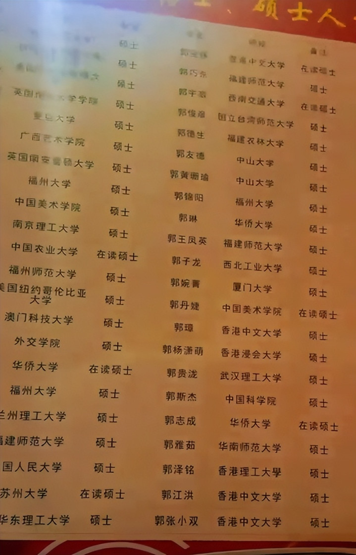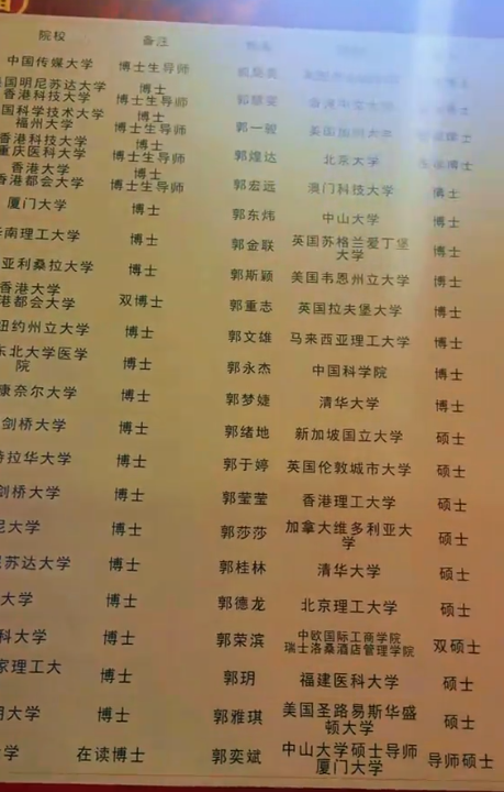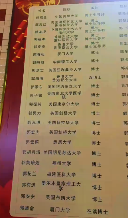 摆了一张超等大的光荣榜,上头有多量姓郭的同学,快乐飞艇app看状态照实王人来自一个系族的。而他们的学历十分惊东说念主,比如前边那几位王人一经是博士生导师了。