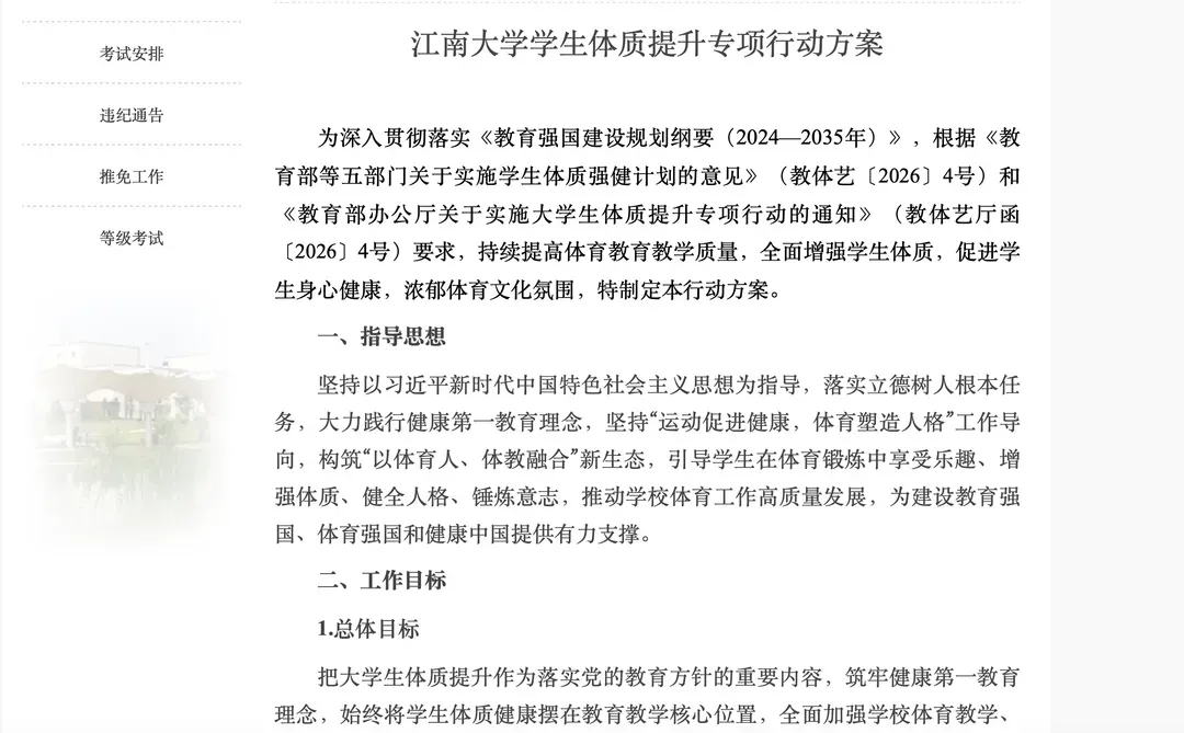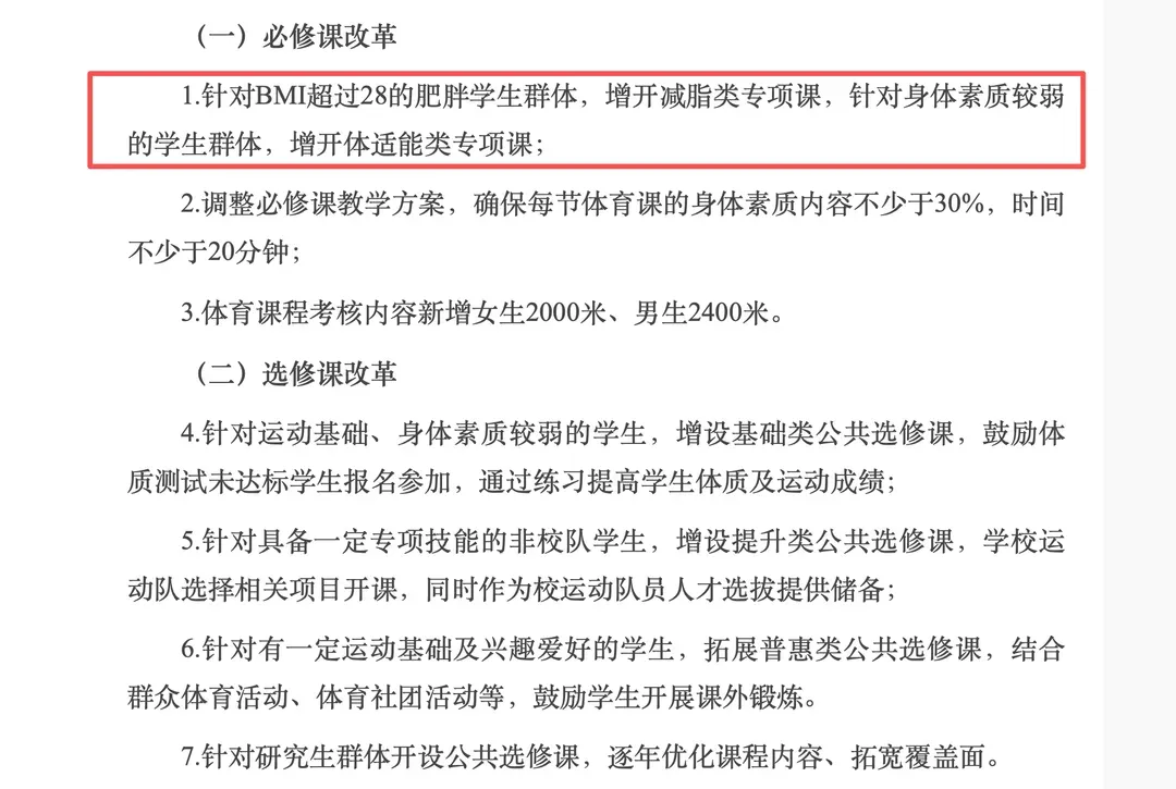 4月7日,江南大学教务处发布《江南大学学生体质栽种专项行径有考虑》,对学校体育陶冶进行全面升级。学校将针对BMI杰出28的肥壮学生群体,增开减脂类专项课,针对肉体涵养较弱的学生群体,增开体适能类专项课,齐为必修课。