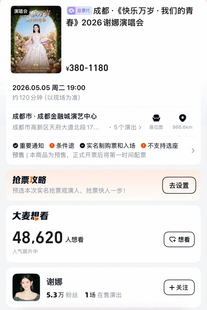 记者庄重到,谢娜个东说念主演唱会成皆站收敛发稿时念念看东说念主数已超4.8万,票价380元至1180元不等。据悉,谢娜曾在2月的直播中示意:“我那些歌也要拿出来见东说念主了。”