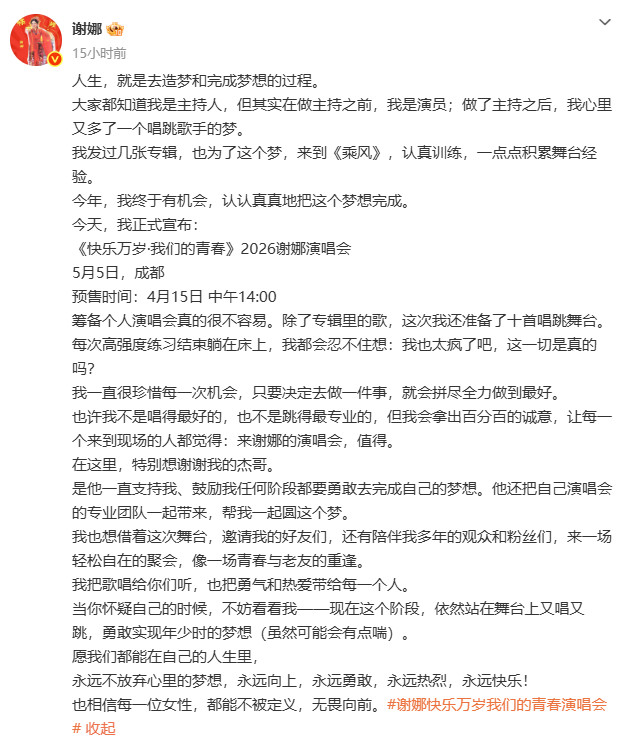 4月11日,谢娜在《乘风2026》直播阉东说念主宣开演唱会。随后,@谢娜发长文回答:运筹帷幄个东说念主演唱会真实很绝交易。除了专辑里的歌,此次我还准备了十首唱舞蹈台。也许我不是唱得最佳的,也不是跳得最专科的,但我会拿出百分百的诚心,让每一个来到现场的东说念主皆以为:来谢娜的演唱会,值得。