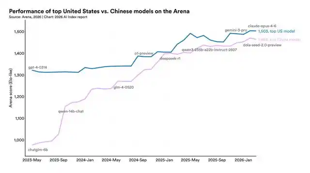 归拢天,斯坦福HAI发布2026 AI Index讲明,数据涌现中好意思最强模子的性能差距只剩2.7%。