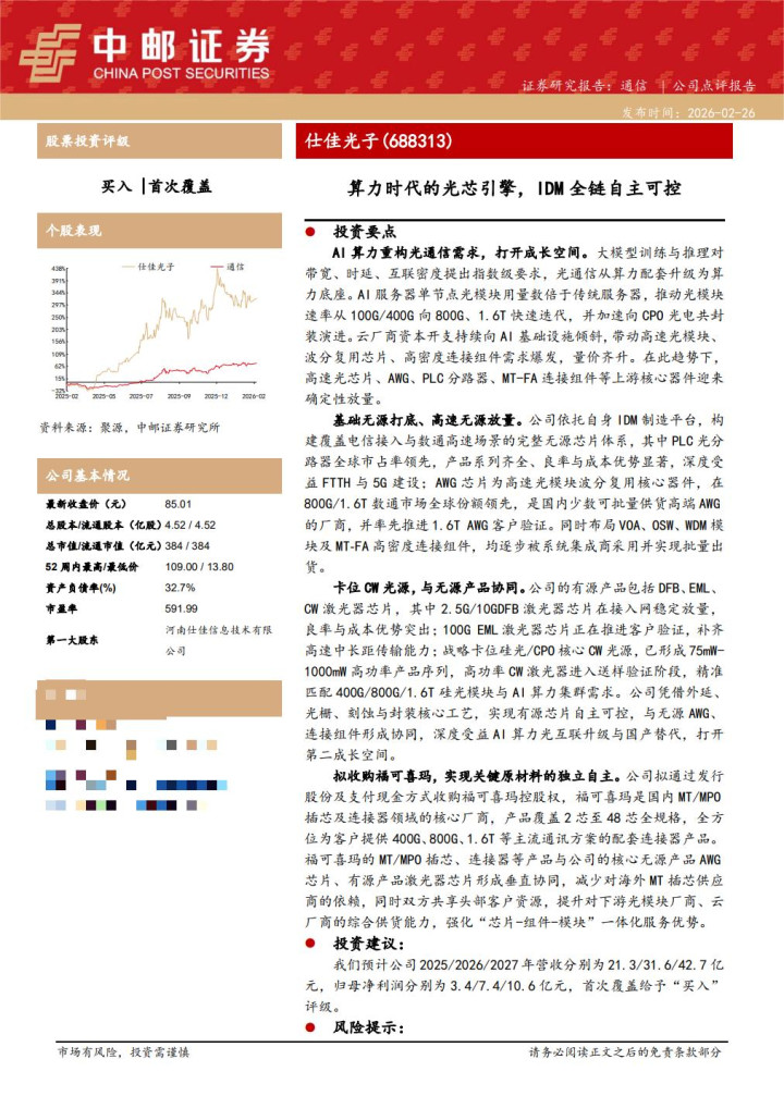 投资者问答方面:公司12.65亿元扩产磋商(高速光芯片与器件样貌)处于里面审批及策划阶段。一季度毛利率环比普及主要系高毛利居品占比提高。适用于1.6T光模块的AWG芯片及组件已驱散小批量出货。高功率CW光源居品中,70-100mW居品已小批量出货,部分居品已完成里面可靠性考证。福可喜玛收购波及的尽调、审计等责任尚未完成,来往价钱未最终细目,存在不细目性。