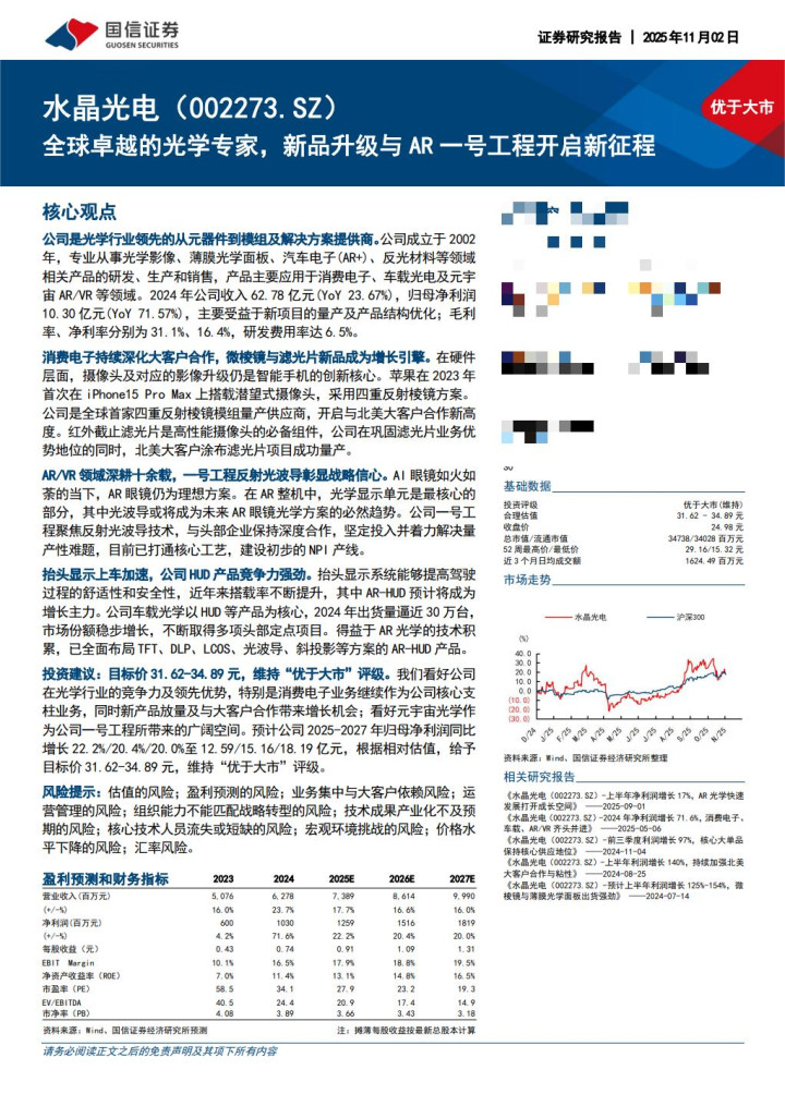 2025年,公司驱散营业收入69.28亿元(+10.37%),归母净利润11.72亿元(+13.84%),毛利率一语气五年增长至31.29%。奢华电子业务营收58.92亿元(+7.41%),中枢增量来餍足客户新样貌及薄膜光学面板;汽车电子(AR+)营收5.86亿元(+95.24%),毛利率普及13.3个百分点;反光材料营收3.99亿元(+1.42%)。2026年力求营收增长10%-30%。