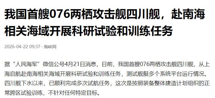 4月21日,国防部发布讯息,中国首艘076两栖膺惩舰四川舰从上海登程,赴南海开展科研纯熟和老师任务。